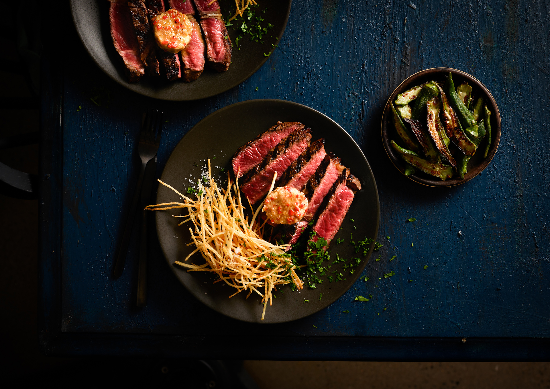 • Combine the butter, chilli, ginger, remaining garlic and allspice in the bowl of a stand mixer and season with salt and a generous amount of pepper. Beat with the paddle attachment on medium speed for 3 minutes, until light. Serve with the steaks, chips and okra.