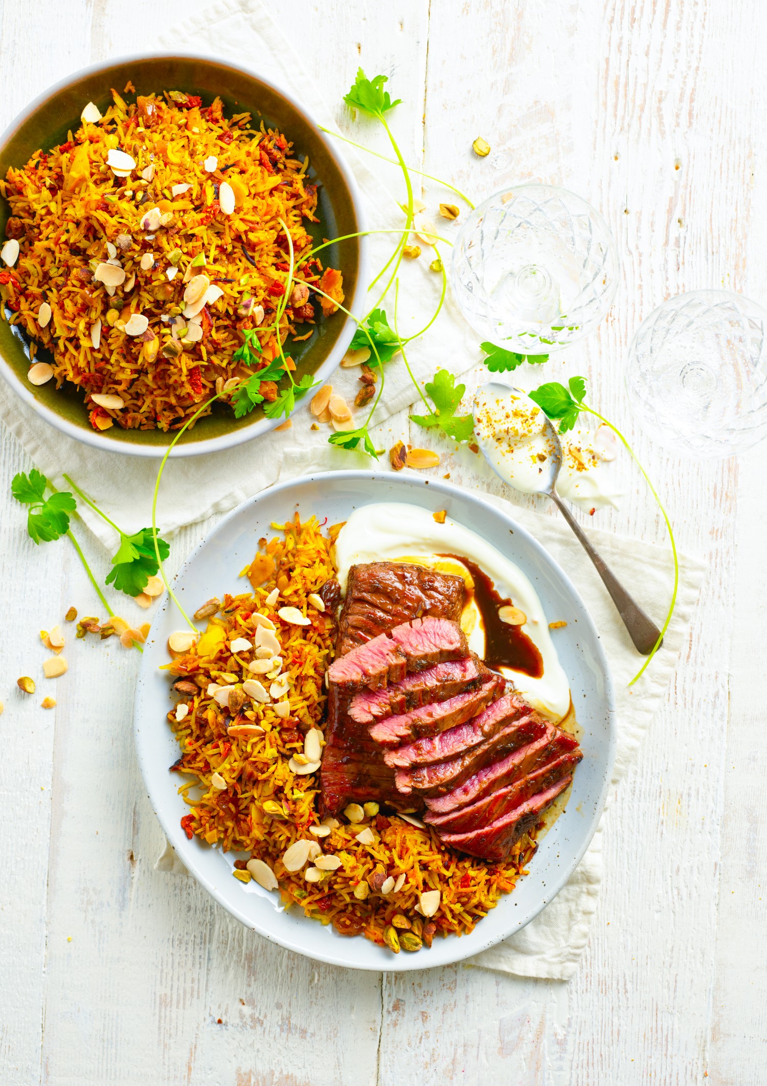 BARBECUED SKIRT STEAK WITH LIME AND PEPPER GLAZE, JEWELLED BIRYANI