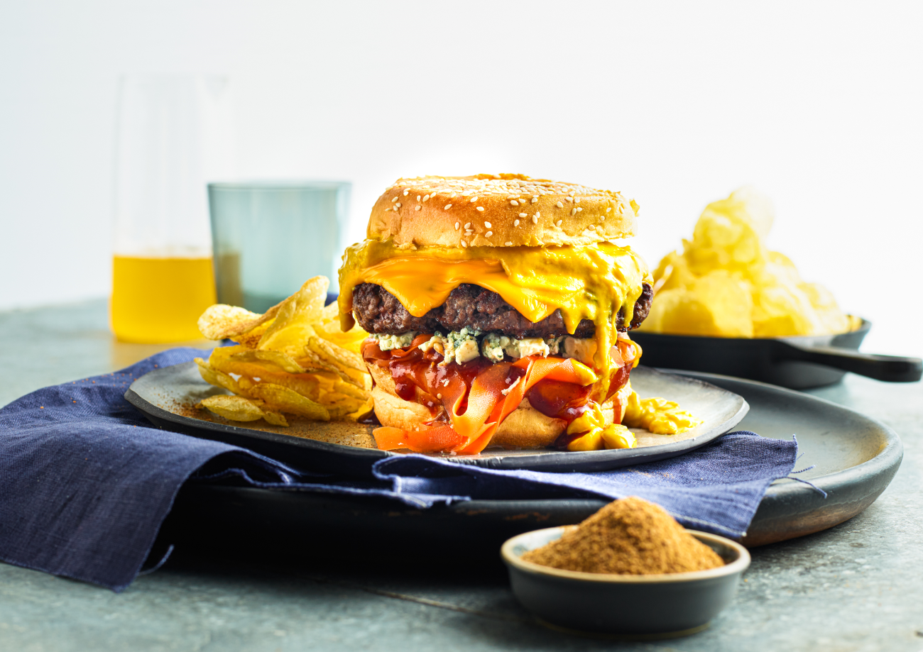 RIB EYE BEEF BURGER WITH THREE CHEESES, TWO SAUCES, ONE PICKLE AND NO SALAD