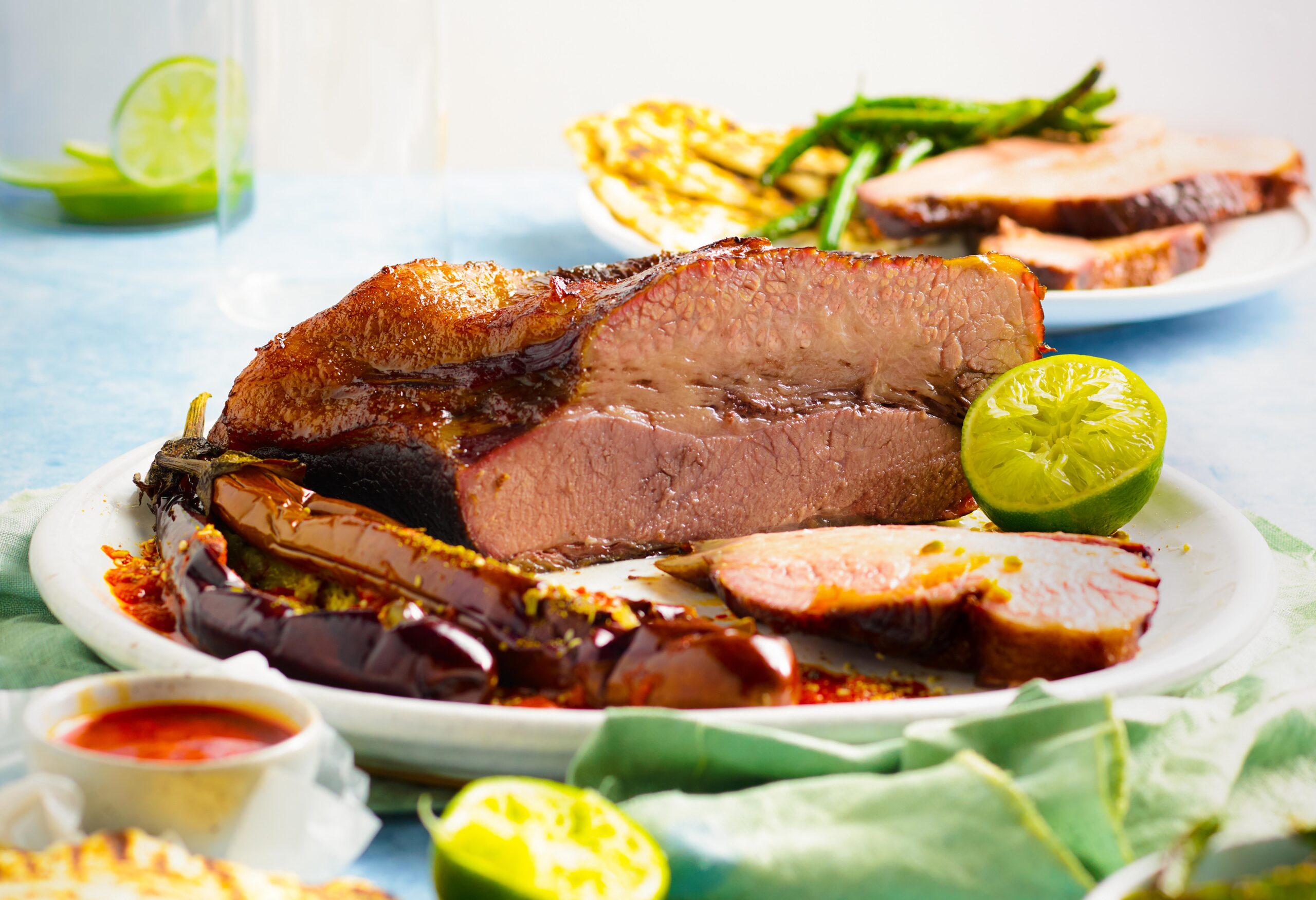 • Cook the eggplants on a hot barbecue grill until blackened, then split open and brush with a mixture of sesame oil and harissa paste. Toss the beans in the olive oil, grill until lightly blackened, then toss with dukkah. Carve the brisket, then serve with eggplant, beans, and grilled flatbread.