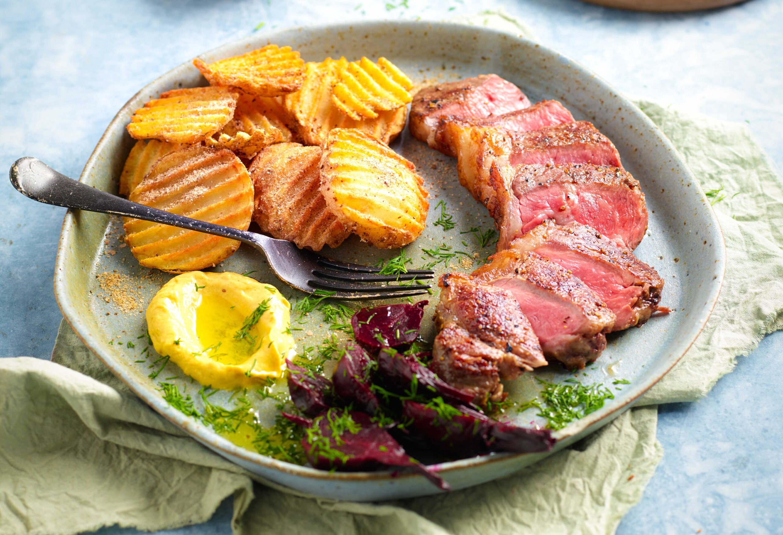 • Carve the steaks and serve with baby beetroot, chips, and a lightly tossed mixture of fennel, beans, and oranges.